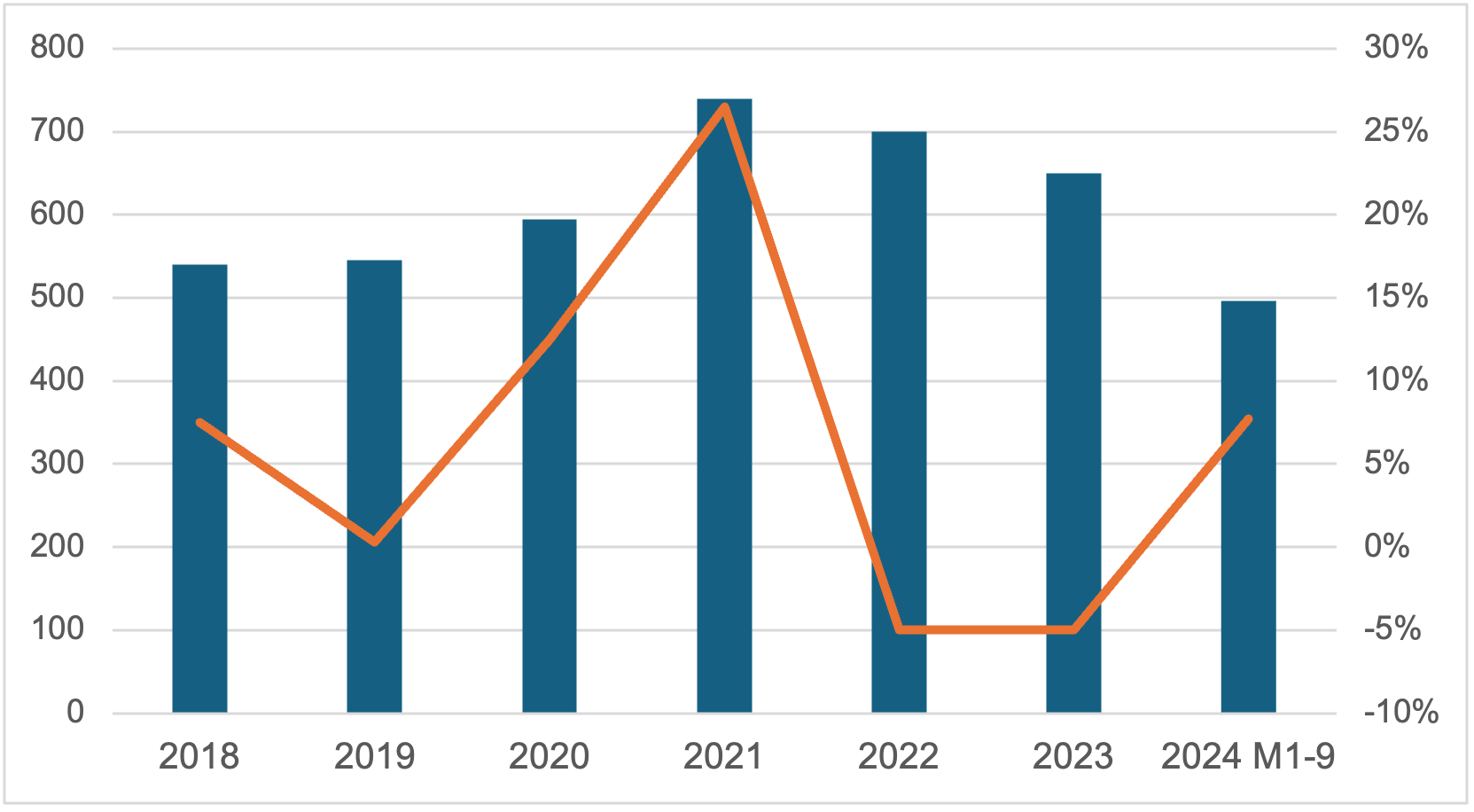 图表 13 2018-2024年1-9月中国家具及其零件出口额(单位:亿美元)