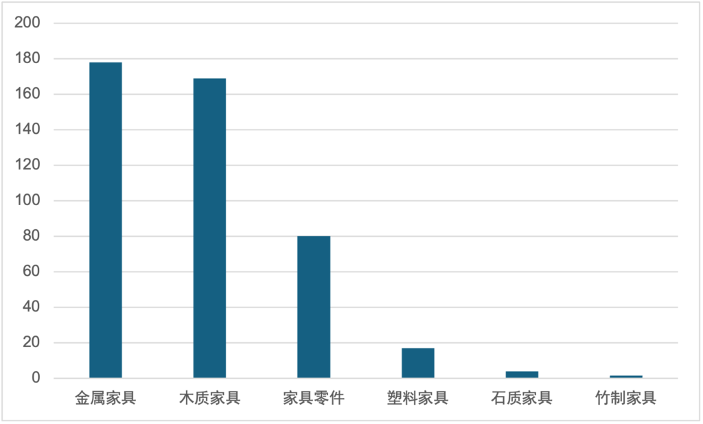 中国是世界第一家具出口国,据埃及内阁信息与决策支持中心公布的数据显示,2021年中国家具出口约占世界的43%,远高于第二名德国的6%。中国海关数据统计,2024年前9个月,中国家具及其零件出口495.4亿美元,较去年同期增7.7%,高出同期我国出口整体增速3.4个百分点。重点品类看,2024年1-9月,金属家具、木制家具、家具零件占据出口额前三位,分别为175.75亿美元、169.08亿美元、80.0亿美元。