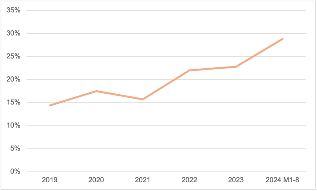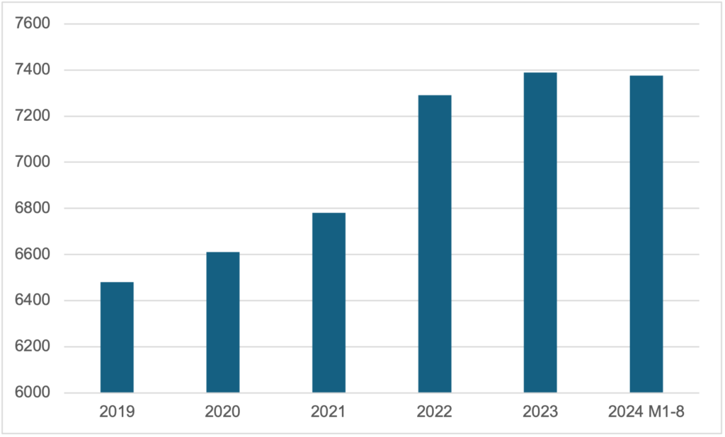 第一,是中国家居行业业内竞争不断加剧,众多头部家居企业纷纷扩展海外市场。中国家居行业业内企业众多,根据国家统计局发布的数据显示,2024年1-8月我国规模以上家具制造业企业数为7,352个,同比增长77%,近10年复合增速超过5%。此外,中国家居行业的市场集中度较低,竞争格局分散,2023年行业CR10仅为16.75%。