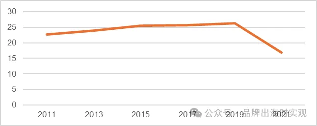 2011年后,随着宏观经济复苏和访日外国游客的增加,日本餐饮行业的需求上升,导致其市场规模连续九年正增长,截至2019年,日本餐饮行业市场规模已达到26.3万亿日元,为近二十年次高峰值。然而,受新冠疫情影响,自2020年起餐饮行业规模断崖式下跌,由2019年的26.3万亿日元下降至2021年的16.9万亿日元。