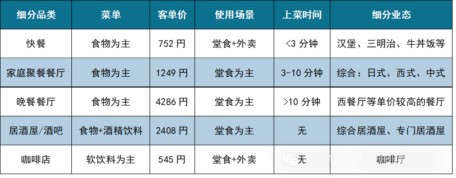 02 日本餐饮市场细分品类及其发展情况日本餐饮业态众多,结合日本食品服务协会、特许经营协会口径,按照客单价、使用场景、上菜时间和餐品种类等标准,日本餐饮行业主要划分为快餐、家庭聚餐餐厅、居酒屋/酒吧、咖啡馆四大细分品类,因此,下文主要围绕这四个赛道,对其市场规模、增长情况以及菜品革新情况进行讨论,旨在分析日本餐饮市场现状及未来发展趋势,为中资企业出海日本提供指引。