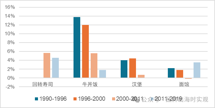 除牛丼饭外,快餐还包括回转寿司、拉面、汉堡这三个子品类,在四个细分品类中,牛丼饭和回转寿司这两种低价连锁日式快餐增长最亮眼。2000-2011年,回转寿司和牛丼饭市场规模分别增长83%、80%左右,年复合增长率约为6%。西式快餐汉堡紧随其后,90年代增长可观,2000年后曾经历过震荡下滑,但整体取得小幅增长。拉面品类作为近十年快速崛起的品类,2011年以后增长迅速,2011-2019年间CAGR超过3%。