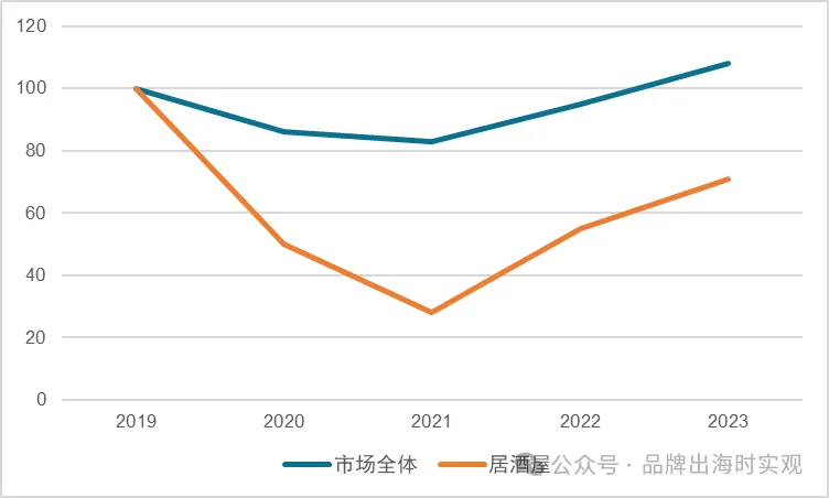 图表 20 居酒屋、餐饮市场整体近年来销售额变动情况(以19年为基准)