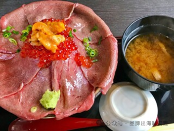 此外,部分商家在制作牛丼饭时,还会将多种食材进行组合,使得牛丼饭口感更具有层次感。如近日在日本社交媒体上爆火的肉装海鲜盖饭店(肉ドレス海鮮丼),此家餐厅唯一的主菜是黑毛和牛海鲜盖饭(黒毛和牛肉ドレス海鮮丼),选取豪华A5和牛,其上放置鲑鱼子和海胆,下面还有生鸡蛋、海螺和少许腌萝卜。由于原料丰富、口感多元,吸引了众多食客前来品尝。