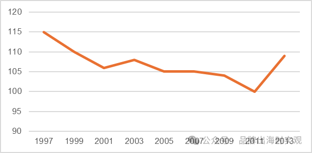 第二,是人均消费支出的下降,根据《社会状况数据目录》、《全国消费实况调查》统计的数据显示,日本居民人均实际外出就餐支出于1997年起开始震荡下滑,直至2011年才恢复增长。从量的角度来看,日本恩格尔系数自1970年开始下滑,2000-2011年一直维持在20%左右的低位振荡区间;此外,居民节俭意识增强、少子老龄化加速也是导致居民人均实际外出就餐支出减少的重要原因;从价的角度来看,餐饮企业为了争夺市场份额,主动降价以迎合消费者的节俭需求,进而导致客单价的下降。