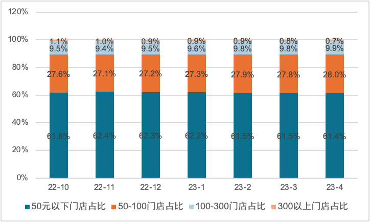 据红餐大数据显示,2022年10月至2023年4月的半年时间内,占行业多数的、菜品均价50元以下的餐饮门店,其数量基本保持稳定;菜品均价在50~100元、100~300元的中端餐饮门店,其数量占比保持小幅上涨;而均价在300元以上的高端餐饮门店,其数量占比则不断下降。这折射出了消费者更偏爱高性价比,连锁餐饮业态与单体门店业态相比,更容易提供口味好又性价比高的产品和服务。