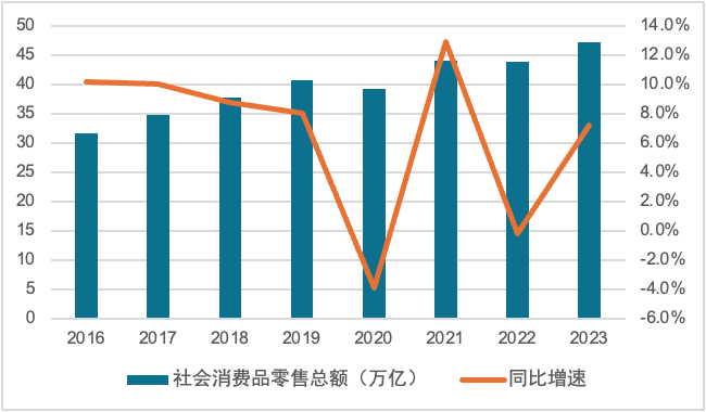 2023年,我国经济在调整中稳步复苏。根据国家统计局及商务部的相关数据,2023年我国GDP达126.06万亿元,同比增长5.2%。固定资产投资增速、对外贸易额增速都呈现小幅减缓或下滑的情况下,社会消费品零售总额保持增长,2023年为47.15万亿元,增速达7.2%,成为拉动经济的核心动力。